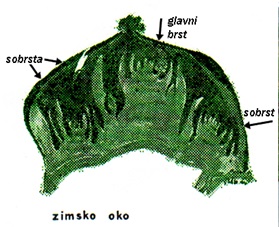 - Glavno zimsko oko je sestavljeno iz glavnega brsta in dveh sobrstov, razlika med njimi je v številu kabrnikov(grozdičev). Seveda glavni brsti, imajo večji rodni nastavek od 2-4 kabrnikov in so ob slani uničeni. Deloma je uničeni že en sobrst v primeru, da je odgnal ali smo ga že odstranili ob pletvi. Rodnost sobrstov je 0-2 kabrnika in jih je trta ustvarila prav za takšne primere, da vsaj z enim grozdom in v jagodi s pečko-semenom ohrani svoj obstoj. Odganjajoča speča očesa na deblu niso prizadeta ali še bodo odgnala, kar jih lahko v najhujših primerih uporabimo za eventualno pomladitev trte.